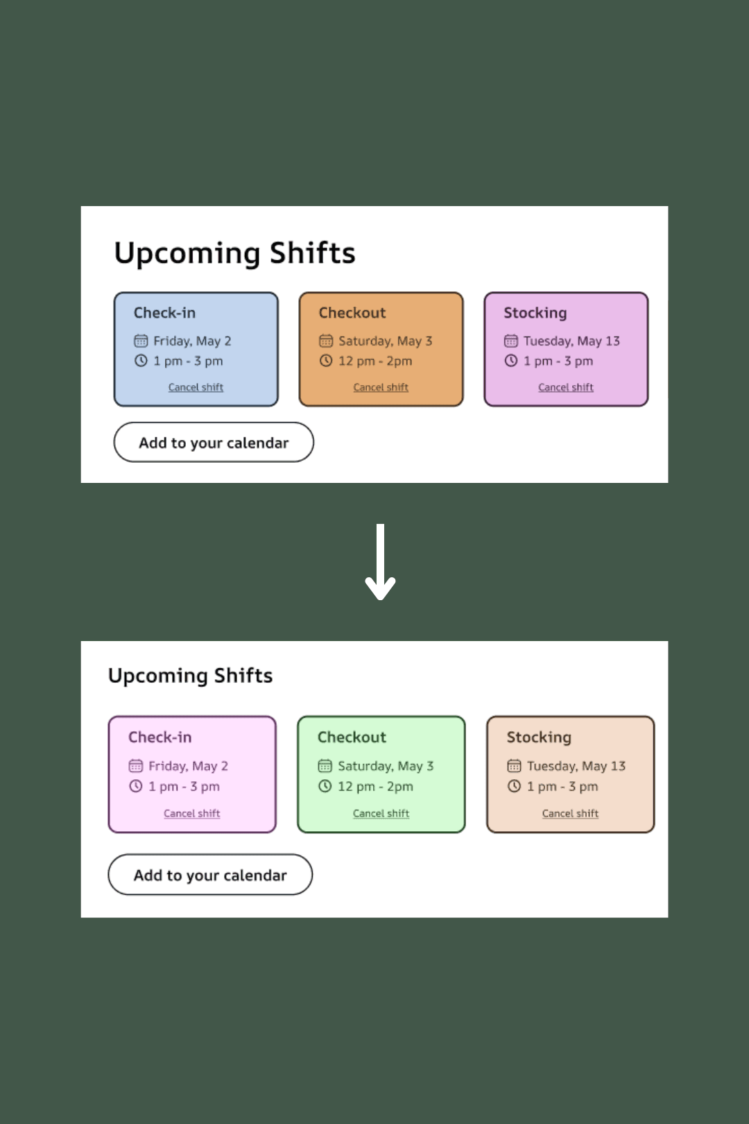 Users found it hard to differentiate the blue and purple originally used to distinguish shift types.